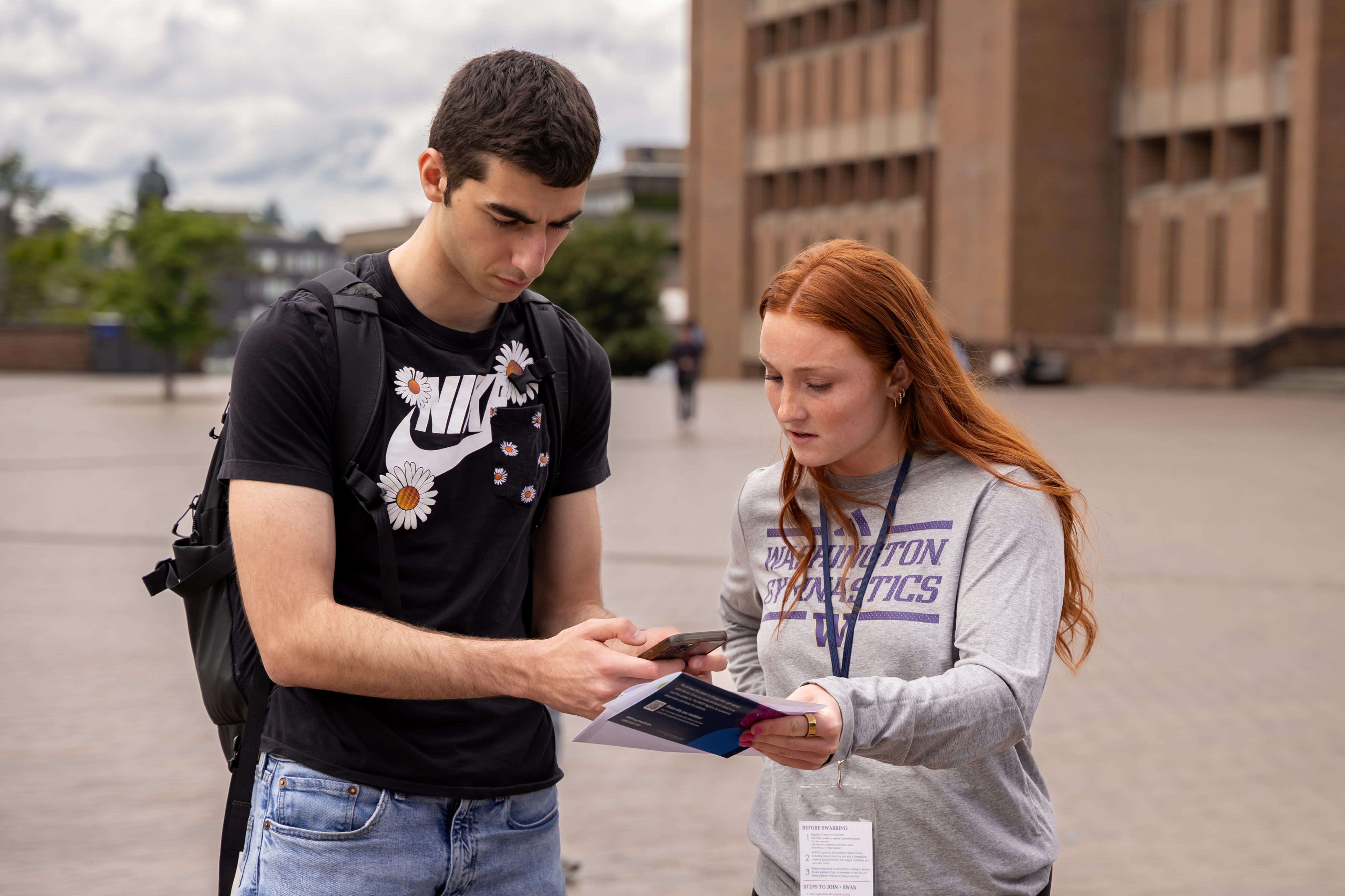 A student passing on their way to class learn about NMDP from a UW Gymnastic athlete.