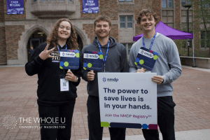 For the past six years, The Whole U has partnered with NMDP (formerly Be The Match) and UW Athletics to host Get in the Game, an annual event encouraging Huskies to join the registry of potential bone marrow and blood stem cell donors. More than 2,000 UW students, staff and faculty have stepped forward over the years, swabbing their cheeks in Red Square and signing up with the hope of one day being called to save a life.
